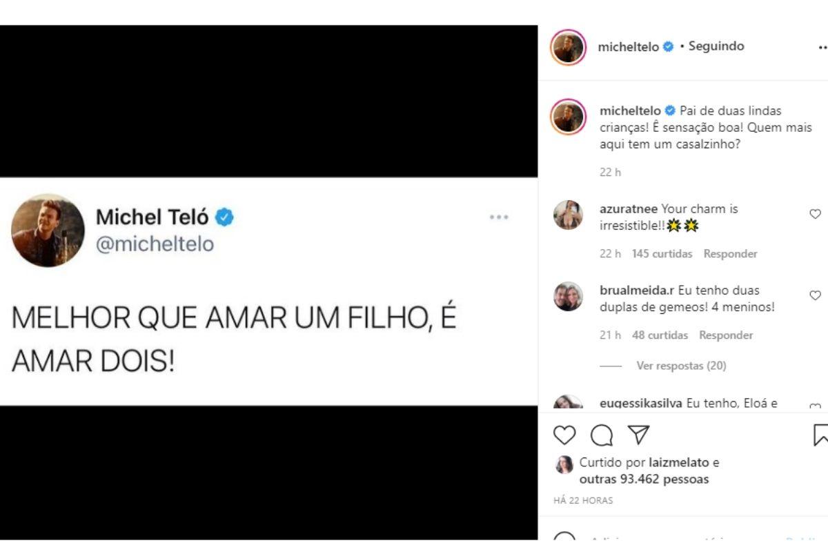 Michel Teló usou as redes sociais nesta segunda-feira, 19 de abril, para falar um pouco sobre a paternidade. No Instagram, ele compartilhou um print de tela de uma publicação que fez originalmente no Twitter. “Melhor que amar um filho, é amar dois”, se declarou ele na publicação. Na legenda, ele falou um pouco mais sobre essa experiência única que é ser pai. “Pai de duas crianças! Ê sensação boa”, escreveu, perguntando aos internautas quem mais era pai de um casal, como ele.