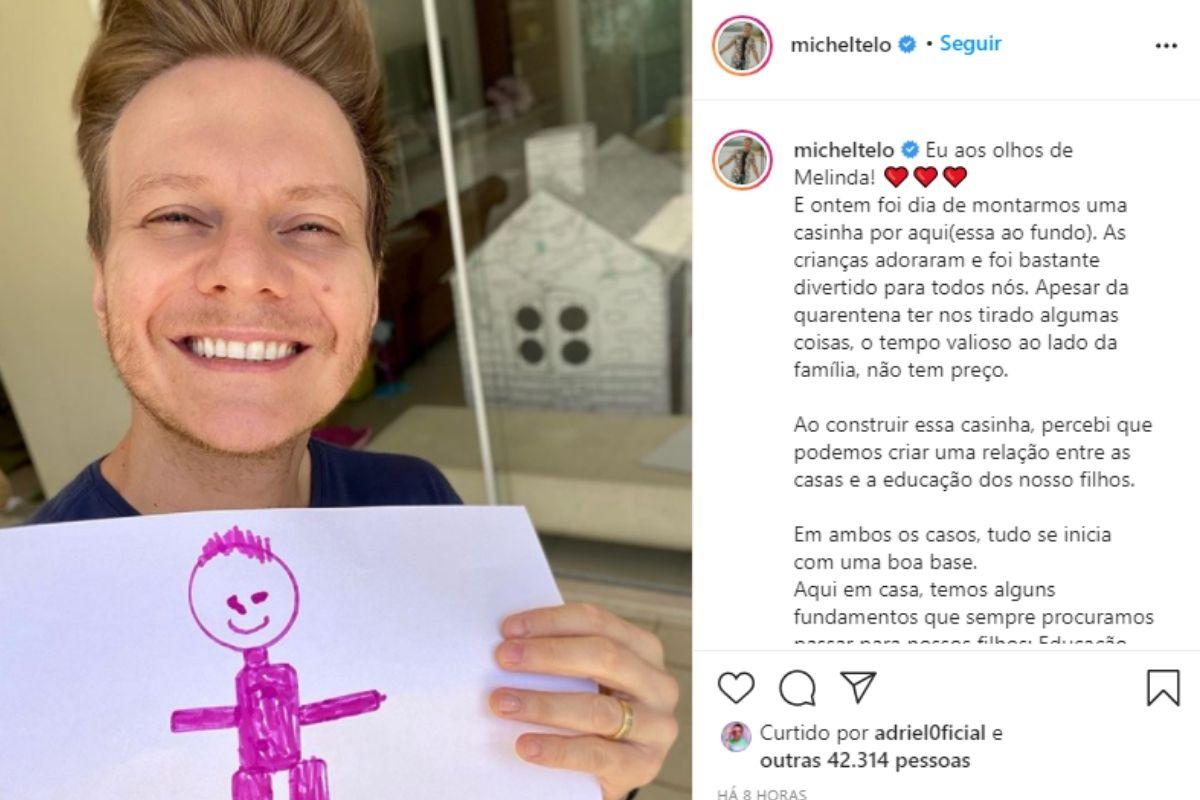 Michel Teló usou as redes sociais nesta terça-feira, 3 de novembro, para falar um pouco sobre a relação com os filhos na quarentena. Casado com a YouTuber Thais Fersoza, o sertanejo é pai de Melinda, de 4 anos, e Theo, de 3. No Instagram, o cantor brincou ao publicar uma foto de um desenho feito pela menina.