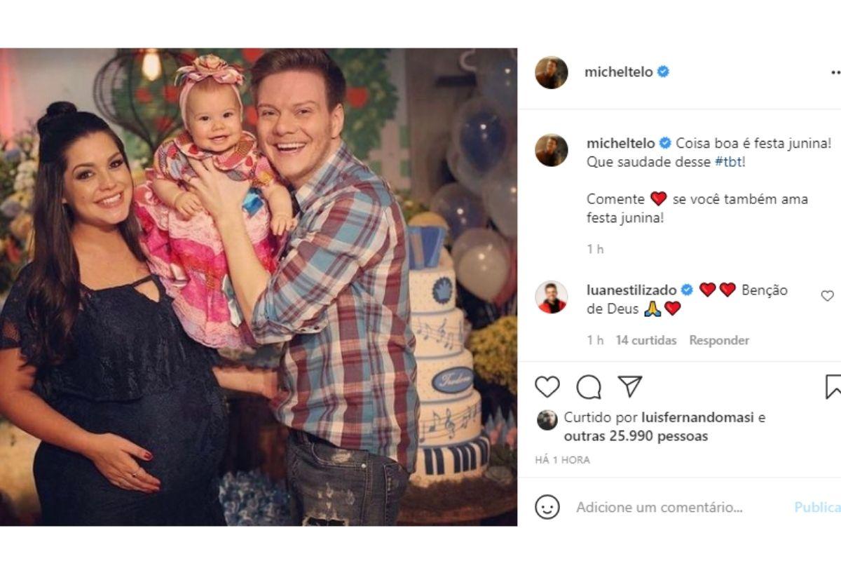 “Coisa boa é festa junina! Que saudade desse #tbt!”, escreveu ele ao compartilhar a foto. O cantor também encorajou os internautas a comentarem com corações se também sentem falta das festas juninas. Na foto compartilhada, Michel Teló aparece ao lado de Thais Fersoza grávida, à espera da Teodoro. A filha mais velha do casal, Melinda, também aparece na comemoração, usando um vestido de caipira, no colo dos pais.