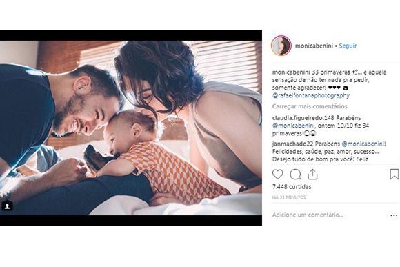 Monica Benini celebra nessa quinta-feira (11) seus 33 anos de idade. A designer de joias publicou em seu Instagram uma foto com o filho, Otto, de 1 ano, o marido, Junior Lima, e a cadela Carlota. Na legenda da foto, a mãe agradece seu aniversário. “33 primaveras… e aquela sensação de não ter nada pra pedir, somente agradecer! @rafaelfontanaphotography“, escreveu na legenda.