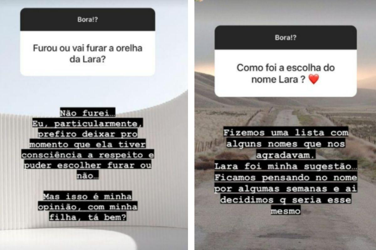 Ela também contou como foi escolher o nome da filha. “Fizemos uma lista com alguns nomes que nos agradavam. Lara foi minha sugestão… Ficamos pensando no nome por algumas semanas e aí decidimos que iria ser esse mesmo”, contou ela.
