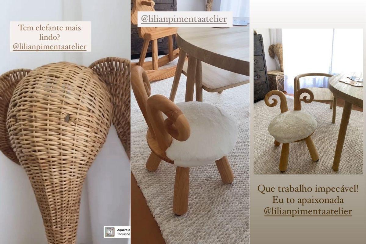 Monica mostrou novos móveis que acabaram de chegar no quarto do menino. Ela mostrou um lindo elefante feito com o que parece ser rattan e que foi colocado como enfeito do quarto. “Tem elefante mais lindo?! eu estou há alguns dias para mostrar essa coisa linda, eu estou assim apaixonada, e olha a parte de trás, é todo reforçado! Muito maravilhoso! Sinceramente!”, disse ela.
