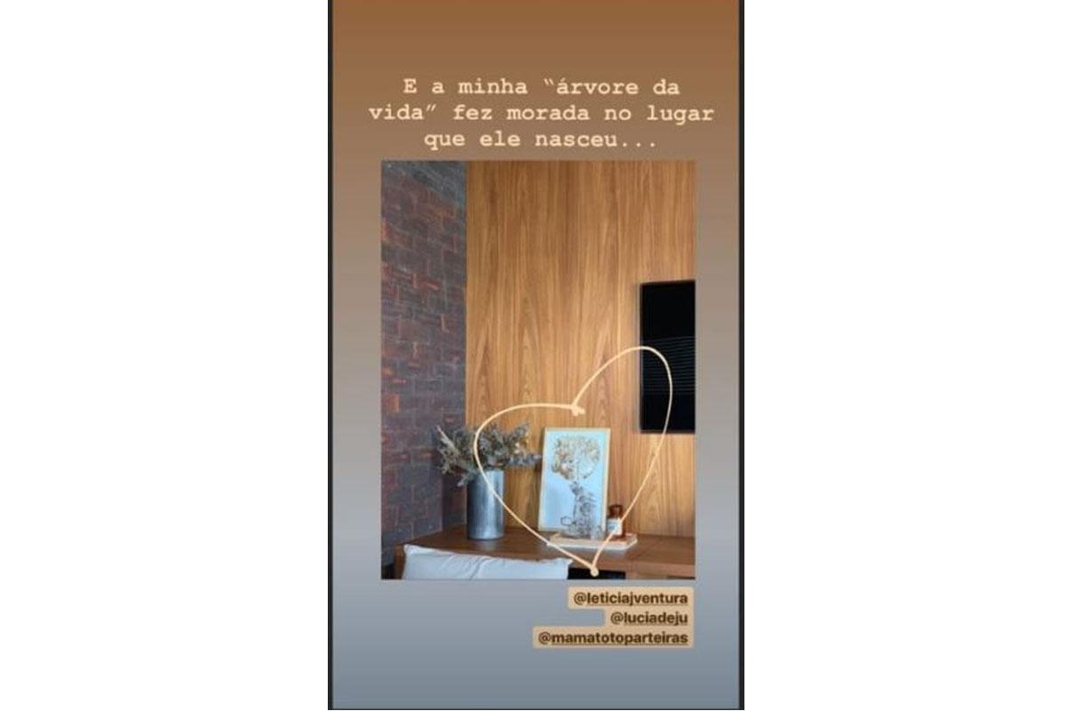 O quadro fica em cima de um móvel no que parece ser a sala da casa da família. Monica não usou de fato a placenta, ela pintou e depois aplicou em um quadro e retirou, como se fosse realmente um carimbo. “E a minha ‘árvore da vida’ fez morada no lugar que ele nasceu…”, escreveu ao mostrar o quadro.