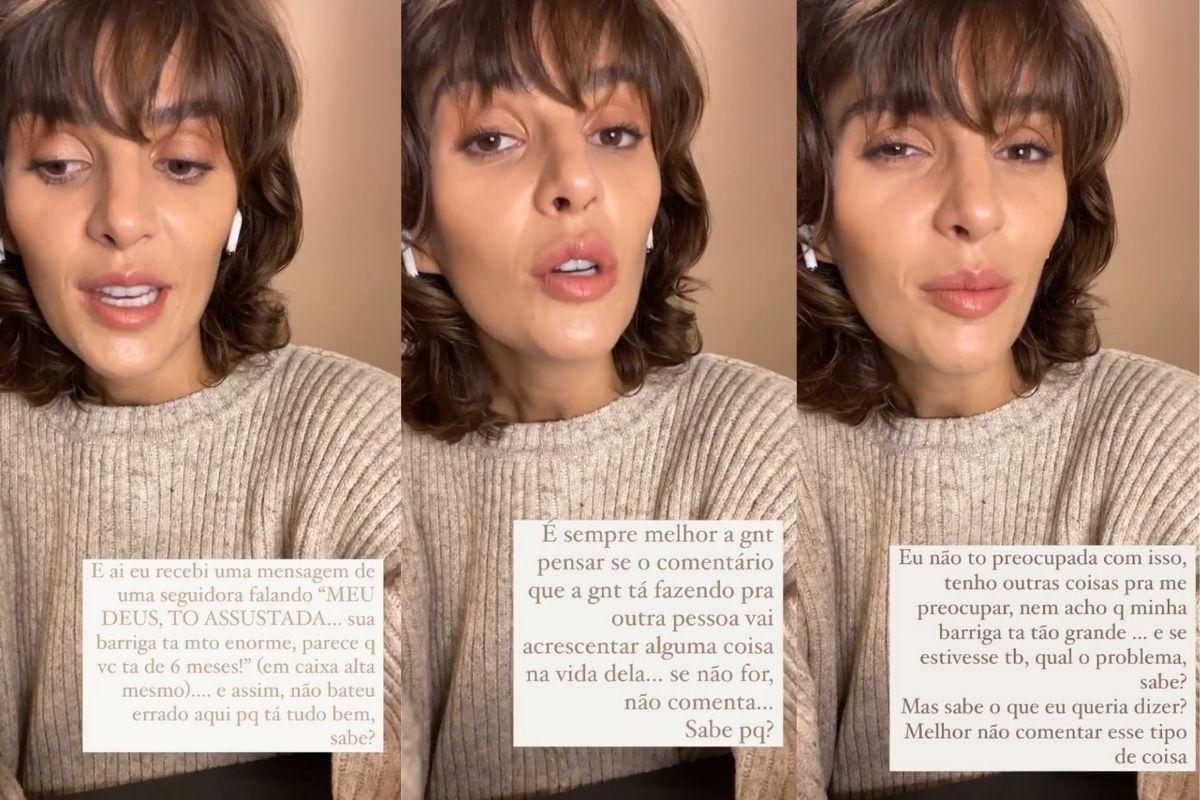 “Recebi uma mensagem de uma seguidora dizendo ‘meu Deus, estou assustada, sua barriga está enorme, parece que você está (grávida) de seis meses. Não bateu errado porque não estou preocupada com isso, não acho que esteja tão grande, e se estivesse não tem problema. Mas é melhor não comentar esse tipo de coisa”, começou.