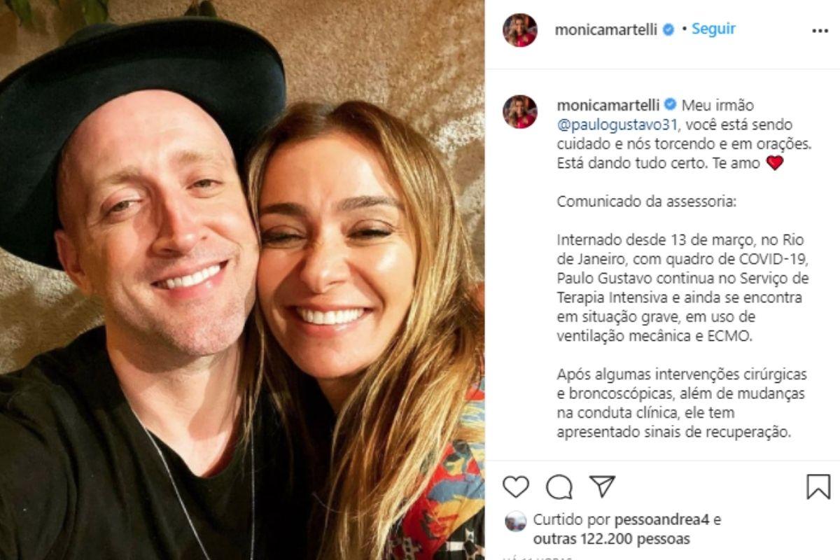 No post do Instagram, Mônica compartilhou um registro ao lado de Paulo Gustavo, com quem atuou nos filmes Os Homens São de Marte… E é pra Lá que Eu Vou! e Minha Vida em Marte. “Meu irmão @paulogustavo31, você está sendo cuidado e nós torcendo e em orações. Está dando tudo certo. Te amo”, declarou ela na legenda.