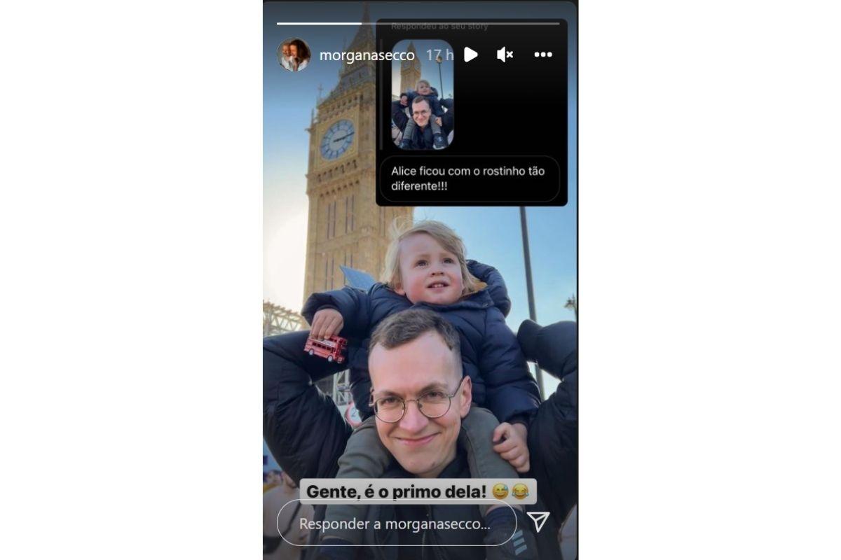 Em um story, Morgana compartilhou um print em que uma seguidora dizia: “Alice ficou com o rostinho tão diferente!”. Em cima da resposta, ela colocou a própria imagem do marido carregando o menino no colo e explicou: “Gente, é o primo dela!”.