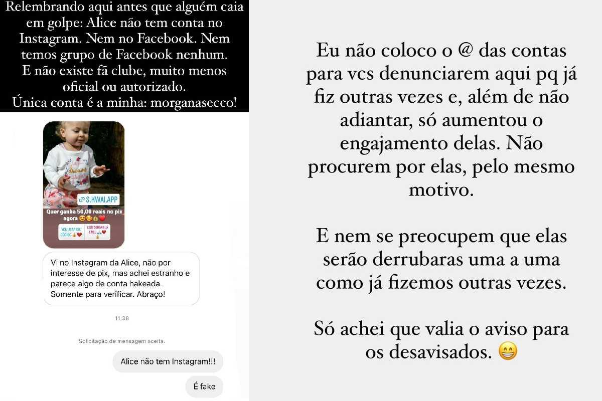 Neste domingo, 23 de janeiro, Morgana Secco utilizou as redes sociais para fazer um novo alerta. Ela compartilhou nos stories um print de um perfil falso fingindo ser a filha dela, Alice, para reafirmar que é fake.