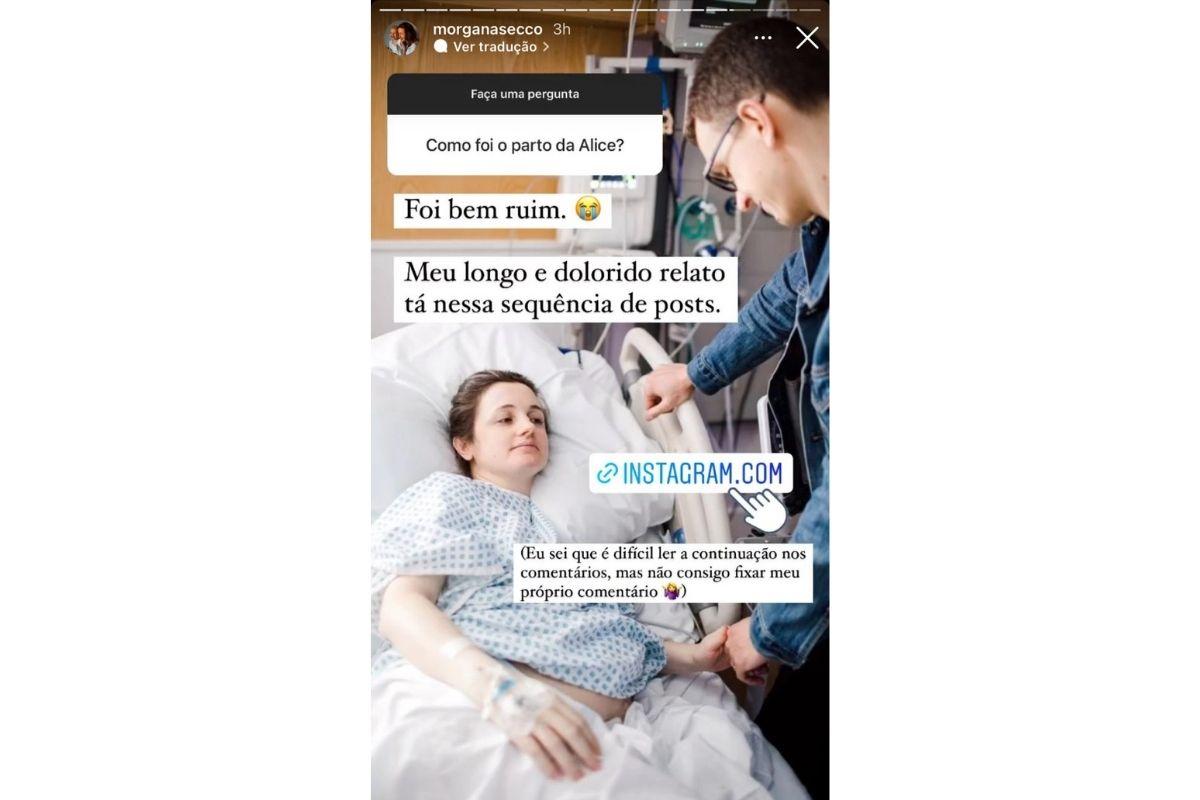 Morgana Secco sempre usa as redes sociais para interagir com seus seguidores e mostrar detalhes da rotina ao lado da filha, Alice. Nesta terça-feira, 26 de outubro, a fotógrafa respondeu perguntas das pessoas que a acompanham no Instagram e falou um pouco sobre seu parto. “Como foi o parto da Alice?”, questionou um seguidor. Por meio dos stories, Morgana respondeu: “Foi bem ruim”. Logo em seguida, ela relembrou o “longo e dolorido relato” compartilhado nas redes sociais com fotos e textos lembrando como foi a experiência dela.