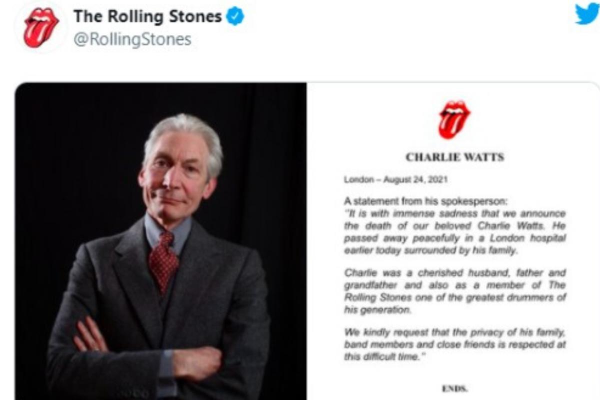 Charlie está na banda desde 1963 e já havia anunciado que não participaria da próxima turnê da banda, chamada de No Filter, por conta da saúde. Ele estava internado em Londres com a companhia da família. Em nota, o agente afirma que Watts era “um marido, pai e avô amado” e “um dos maiores bateristas de sua geração”.