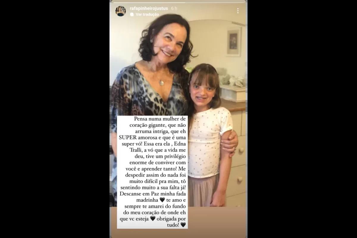 Rafa Justus, enteada de Cesar, também lamentou a perda. “Pense em uma mulher de coração gigante, que não arruma intriga, é super amorosa, e que é uma super avó. Essa era ela, Edna Tralli, a avó que a vida me deu”, escreveu a jovem de 13 anos. “Tive o privilégio enorme de conviver com você e aprender tanto! Me despedir assim do nada foi muito difícil, estou sentindo muito a sua falta, já. Descanse em paz, minha fada madrinha. Te amo e sempre te amarei do fundo do meu coração, onde quer que você esteja. Obrigada por tudo”.
