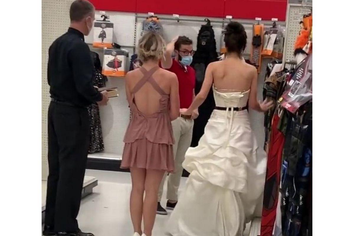 Vestida de branco e carregando um buquê, a mulher emboscou o parceiro enquanto ele enchia as prateleiras com fantasias de Halloween. Ao aparecer pronta para o casamento, ela exigiu que o noivo casasse com ela naquele mesmo instante! A cena de cair o queixo foi capturada pelas câmeras de segurança no local e compartilhada no TikTok.