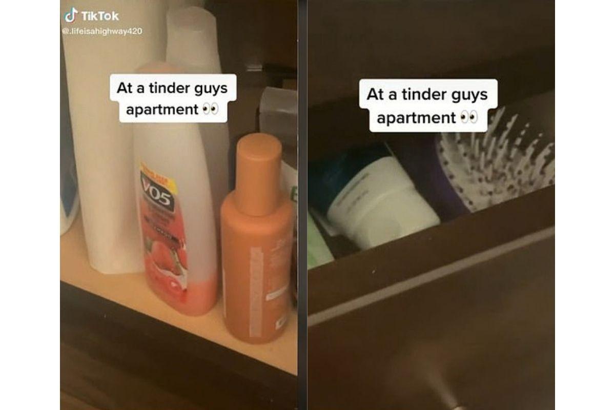 Uma mulher descobriu que o namorado que conheceu no Tinder estava traindo sua namorada de longa data com ela depois de encontrar cosméticos e um teste de gravidez em seu banheiro Elle compartilhou um vídeo no TikTok dela mesma apontando todos os produtos femininos que estavam escondidos dentro do armário e gavetas do cara.