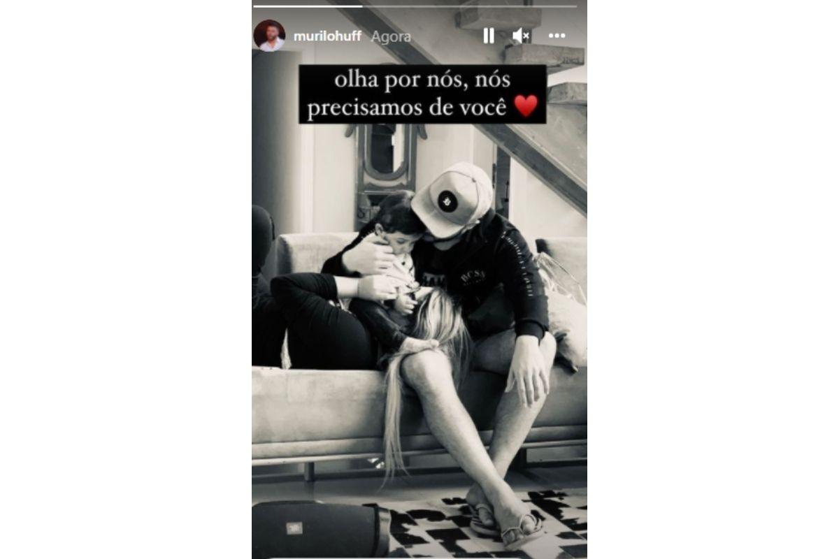 Na primeira delas, Murilo e Marília aparecem em uma selfie com os rostos colados e sorrindo. Na sequência, um clique inédito mostra o casal brincando com o filho Leo, de 1 ano e 10 meses. Sobre esse registro, o pai escreveu, “Olha por nós, nós precisamos de você”.