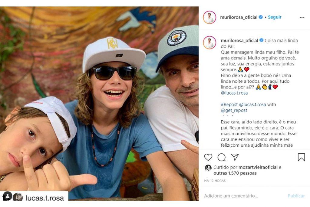 “Esse cara, aí do lado direito, é o meu pai. Resumindo, ele é o cara. O cara mais maravilhoso desse mundo. Esse cara me ensinou como viver e ser feliz (com uma ajudinha minha mãe @fernandatavares_official 😝). E hoje é o dia desse cara. Hoje ele faz 50 anos de vida (talvez 32🤔), e ele continua me ensinando a como viver a vida do melhor jeito possível. Eu te amo pai. Feliz aniversário @murilorosa_oficial 👏🙌🎉🎊”, escreveu o filho com uma foto ao lado do pai e do irmão.