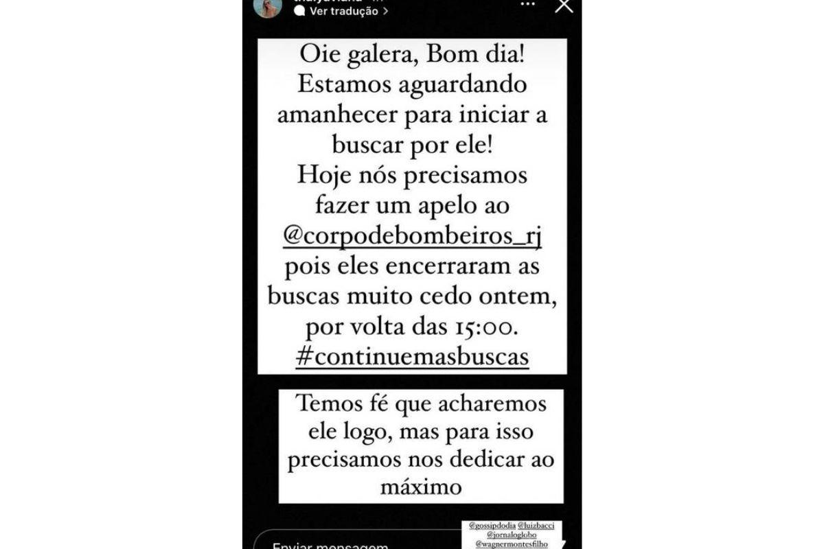 Mais cedo neste mesmo dia, Thayla ainda tinha publicado um outro stories – desta vez, para tranquilizar seguidores a respeito do paradeiro de José. “Oie galera, Bom dia! Estamos aguardando o sol nascer para iniciar a busca por ele! Hoje nós precisamos fazer um apelo ao @corpodebombeiros_rj pois eles encerraram as buscas muito cedo ontem, por volta das 15h”.