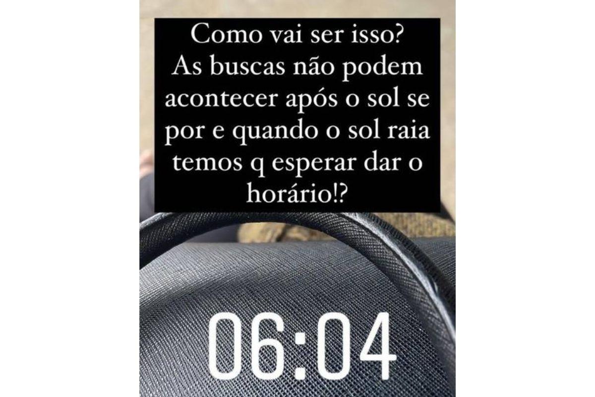 Segundo ela, a equipe estava aguardando a liberação do condomínio de Laranjeiras, em Paraty, para que começasse efetivamente o processo de buscas. Contudo, a situação aconteceu com horas de atraso, conforme narrou nos stories do Instagram.