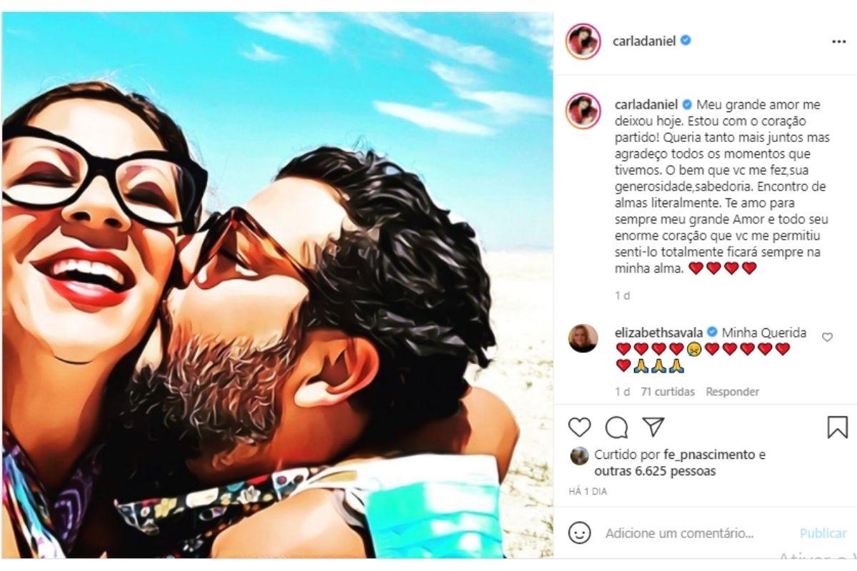 “Meu grande amor me deixou hoje. Estou com o coração partido! Queria tanto mais juntos, mas agradeço todos os momentos que tivemos. O bem que você me fez, sua generosidade, sabedoria. Encontro de almas literalmente. Te amo para sempre meu grande amor e todo seu enorme coração que você me permitiu senti-lo totalmente ficará sempre na minha alma”, escreveu. A declaração foi acompanhada de uma foto estilizada do casal.