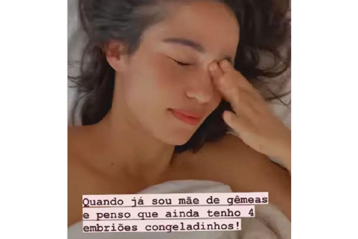 No vídeo, publicado nos Stories do Instagram, a atriz aparece pensando sobre a possibilidade de ser mãe novamente, mas logo em seguida faz uma cara de preocupação. “Quando já sou mãe de gêmeas e penso que ainda tenho 4 embriões congeladinhos”, escreveu ela, ao publicar as imagens.