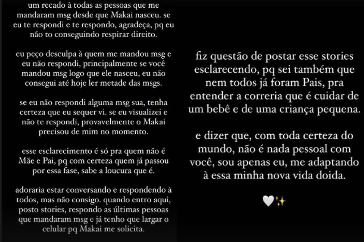 A mãe de primeira viagem explicou o motivo de não conseguir retornar as mensagens. “Se eu te respondi e te respondo, agradeça, porque não estou conseguindo respirar direito. Peço desculpas a quem mandou mensagem e eu não respondi, principalmente se você mandou logo que ele nasceu. Eu não consegui até hoje ler metade das mensagens”, iniciou Petra.