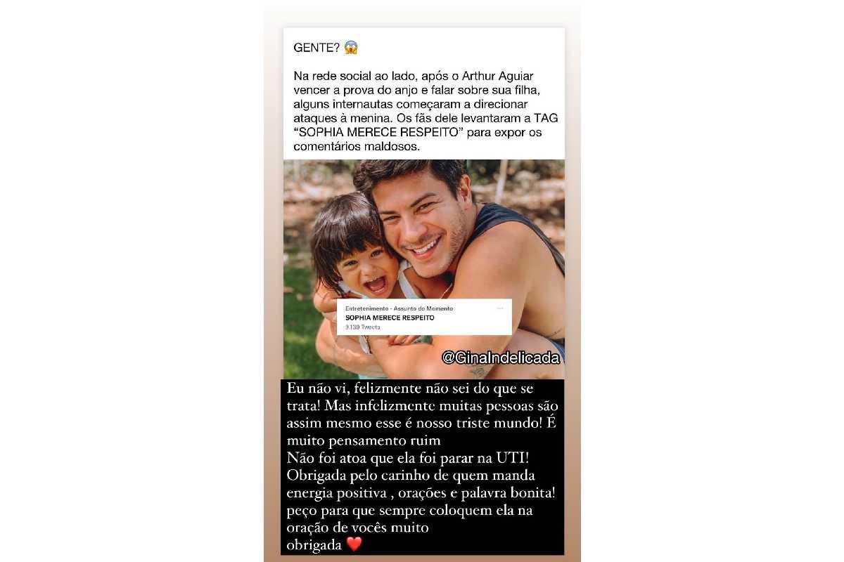 Diante da situação, a equipe do artista se pronunciou nas redes sociais e disparou: “Sophia merece respeito”. A noite, o ocorrido entrou nos assuntos mais comentados do Twitter, com diversos internautas defendendo a menina de 3 anos.