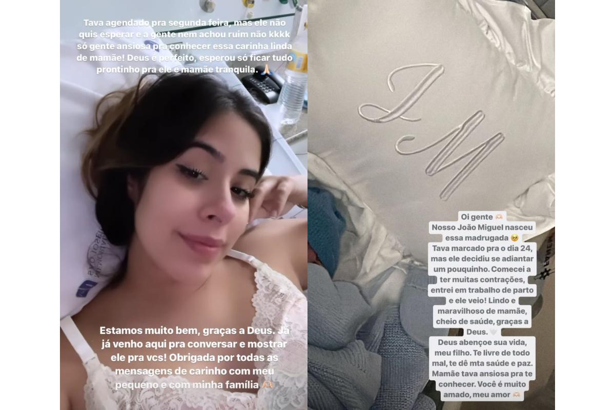 Ela também disse que o filho, João Miguel, veio antes da data planejada: “Estava agendado para segunda-feira, mas ele não quis esperar que a gente nem achou ruim não. Só gente ansiosa para conhecer essa carinha linda da mamãe. Deus é perfeito, esperou só ficar tudo prontinho para ele e mamãe tranquila”.