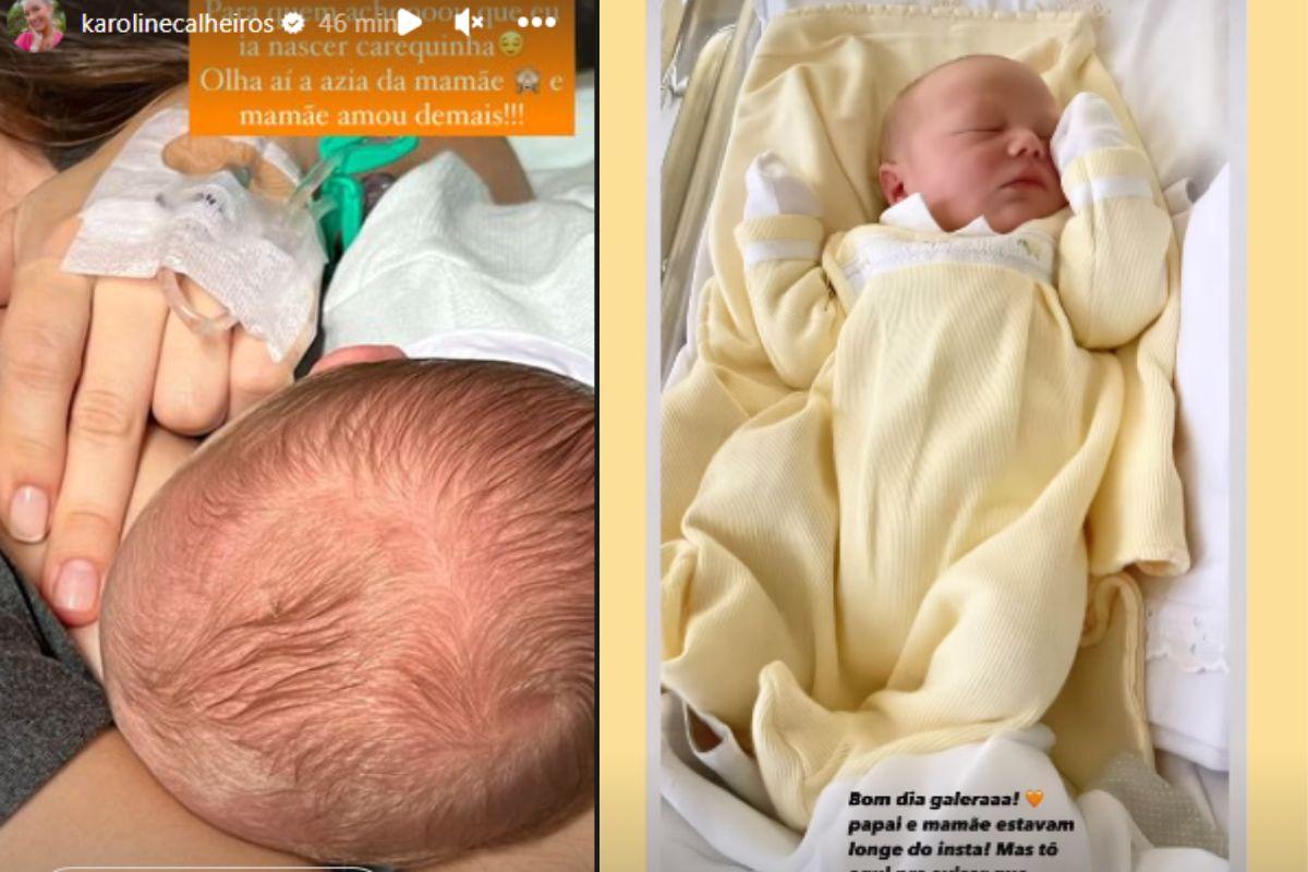 Nos stories Karoline também mostrou que o filho, contrário do que alguns seguidores pensavam, nasceu com cabelo e ela brincou com a situação: “para quem achou que eu ia nascer carequinha, olha ai a azia da mamãe! E mamãe amou demais”, escreveu a influenciadora nos stories.