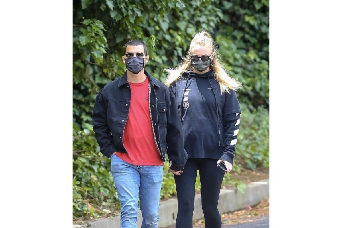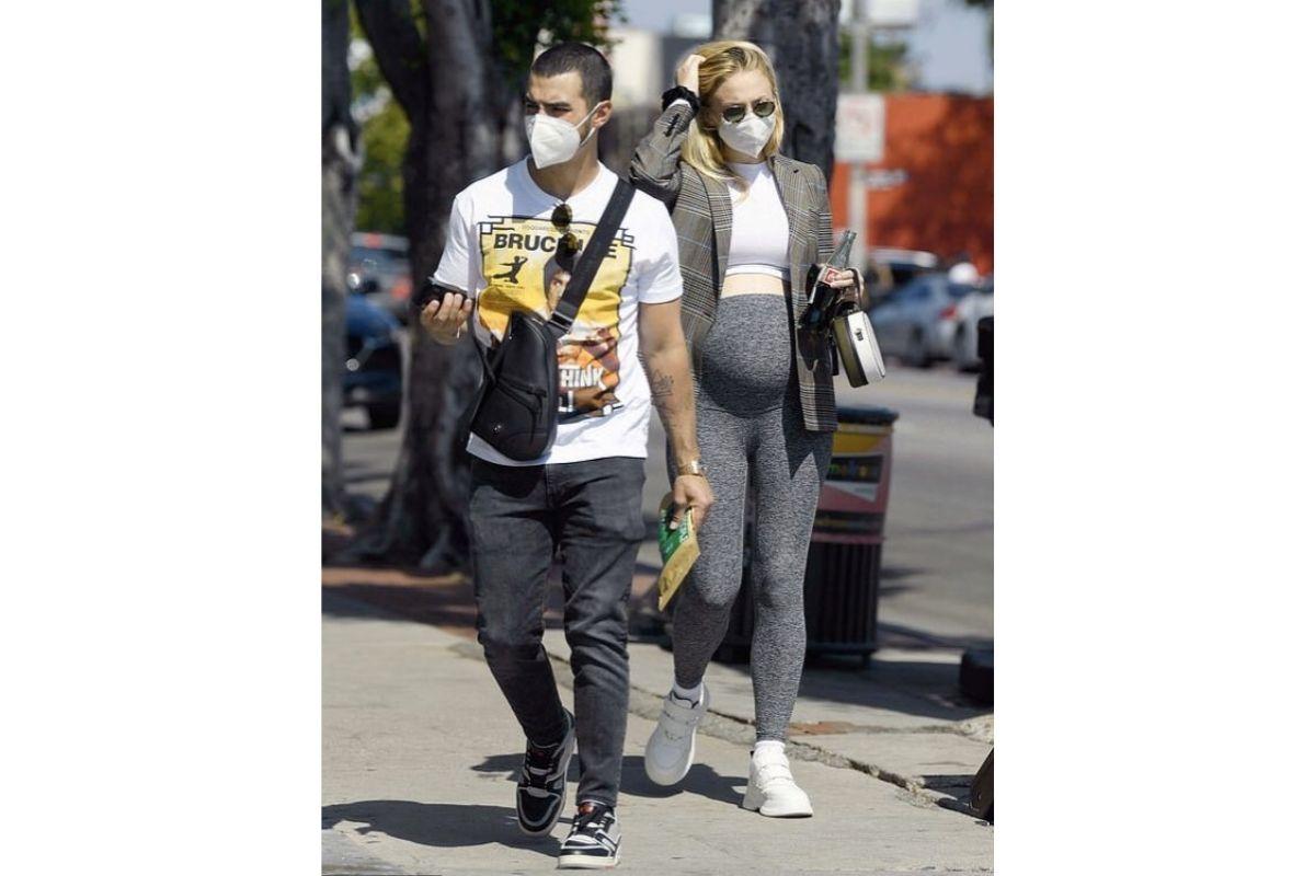 Sophie, que teve a gravidez comentada em fevereiro deste ano, apareceu ao lado do marido, Joe Jonas durante uma caminhada. Ela usava uma máscara facial, um blazer e um top de faixa branco.