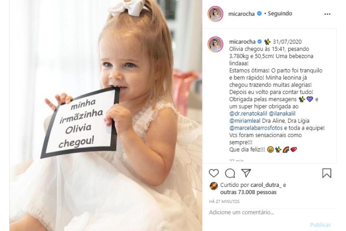 A novidade foi anunciada pelas redes sociais da influenciadora digital, que deu mais detalhes sobre o nascimento de Olívia: “Estamos ótimas! O parto foi tranquilo e bem rápido! Minha leonina já chegou trazendo muitas alegrias! Depois eu volto para contar tudo! Obrigada pelas mensagens e um super hiper obrigada a toda a equipe! Vcs foram sensacionais como sempre!!! Que dia feliz!!!”