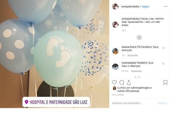 O anúncio foi feito pela mãe da atriz, Sonia Balsalôbre, nas redes sociais. “Nasceu meu netinho Gael. Apressadinho! Veio um mês antes!”, escreveu a avó na legenda da publicação.