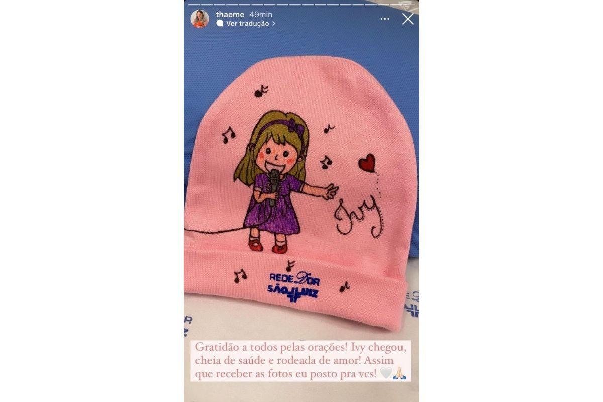 Por meio dos stories do Instagram, a cantora publicou uma foto do gorro da maternidade da filha para anunciar a chegada da bebê ao mundo. “Gratidão a todos pelas orações! Ivy chegou, cheia de saúde e rodeada de amor! Assim que receber as fotos eu posto para vocês!”, ela finalizou.