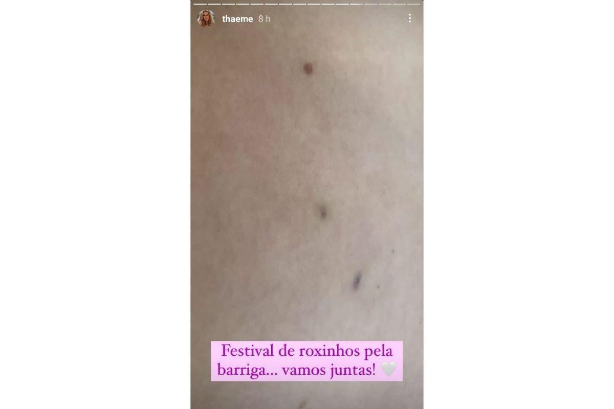 No Instagram ela mostrou como fica a barriga depois da aplicação da medicação. “Festival de roxinhos pela barriga… vamos juntas!”, escreveu a sertaneja, que recebeu mensagens de mulheres que também passam pelo mesmo problema. Sobre o tratamento para trombofilia a artista explicou: “Injeções de anticoagulantes todos os dias até 40 dias dias depois de ganhar o bebê. São as picadinhas do amor”.