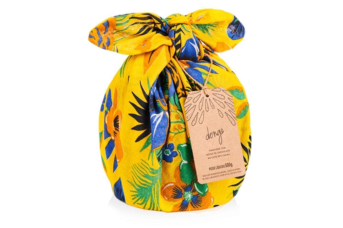 O chocottone da Dengo já conquista logo de cara pela embalagem: de tecido, bem colorido e alegre. A massa é feita com gotas de chocolate ao leite 50% cacau e é finalizado com uma crosta de castanha de caju. O preço sugerido é R$88 e pode ser encontrado em dengo.com.br.