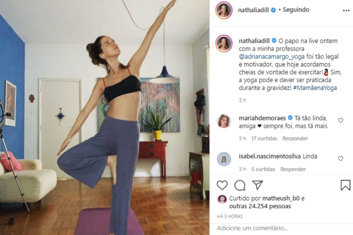 A atriz Nathalia Dill usou as redes sociais para compartilhar uma foto praticando ioga. A famosa está no 5° mês de gestação, a espera do primeira filha, fruto do relacionamento com o noivo Pedro Curvello. Junto com a imagem, a famosa falou um pouco sobre a prática do esporte e contou que havia participado de uma live com uma professora no dia anterior, que a motivou a praticar o exercício. “Sim, a yoga pode e deve ser praticada durante a gravidez! Mamãe na yoga”, reforçou, junto à foto.