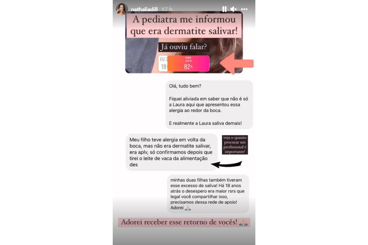 Na plataforma, a atriz abriu uma enquete para perguntar se os fãs já ouviram falar sobre dermatite salivar nas crianças, e agradeceu o retorno que eles deram por meio de depoimentos: “Fiquei aliviada em saber que não é só a Laura aqui que apresentou essa alergia ao redor da boca.”, escreveu uma. “Minhas duas filhas também tiveram esse excesso de saliva!”, comentou outra.