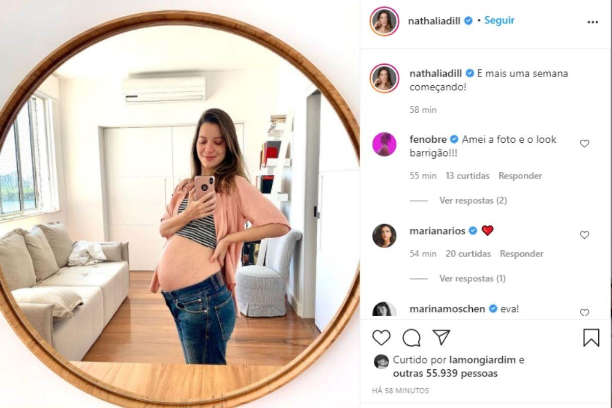 Na legenda, ela mostrou mostrou a ansiedade contando as semanas da gestação. “E mais uma semana começando!”, escreveu Nathalia na rede social. Nos comentários, atriz ganhou mensagens carinhosas e muitas curtidas de famosos como Mariana Rios, Marina Moschen, Cauã Reymond, Mariana Goldfarb, Rodrigo Simas, entre outros.