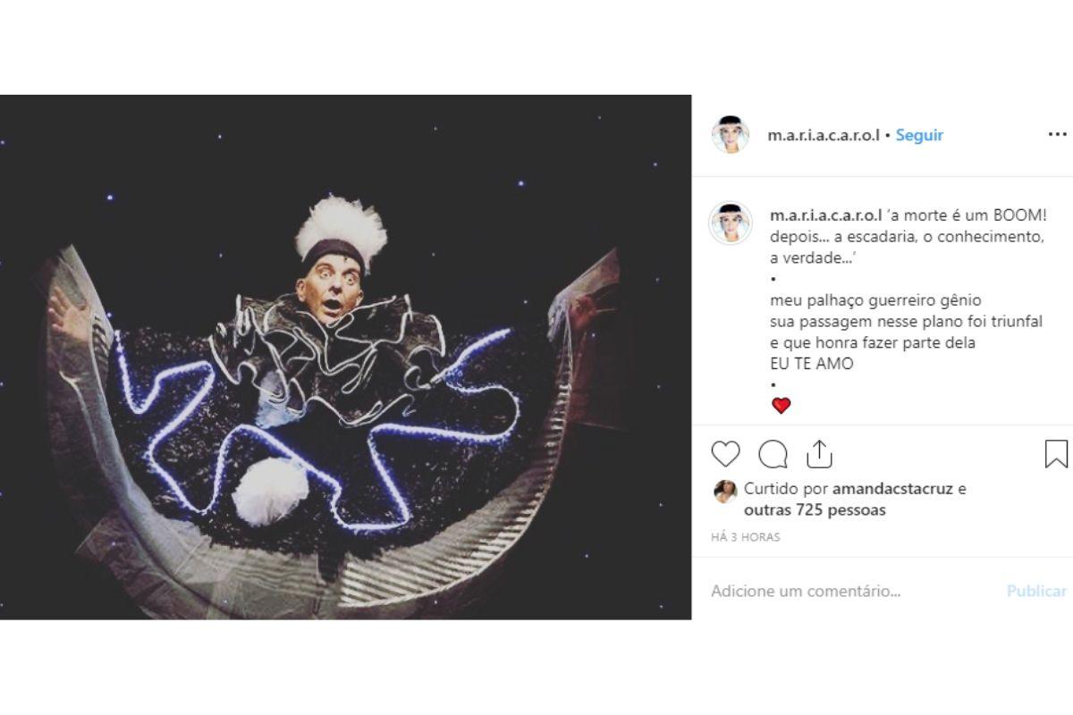 Maria Carol começa o seu texto de despedida com uma parte de uma fala do espetáculo BOOM, que foi protagonizado pelo tio. “A morte é um boom! Depois… a escadaria, o conhecimento, a verdade… meu palhaço guerreiro gênio sua passagem nesse plano foi triunfal e que honra fazer parte dela! EU TE AMO”