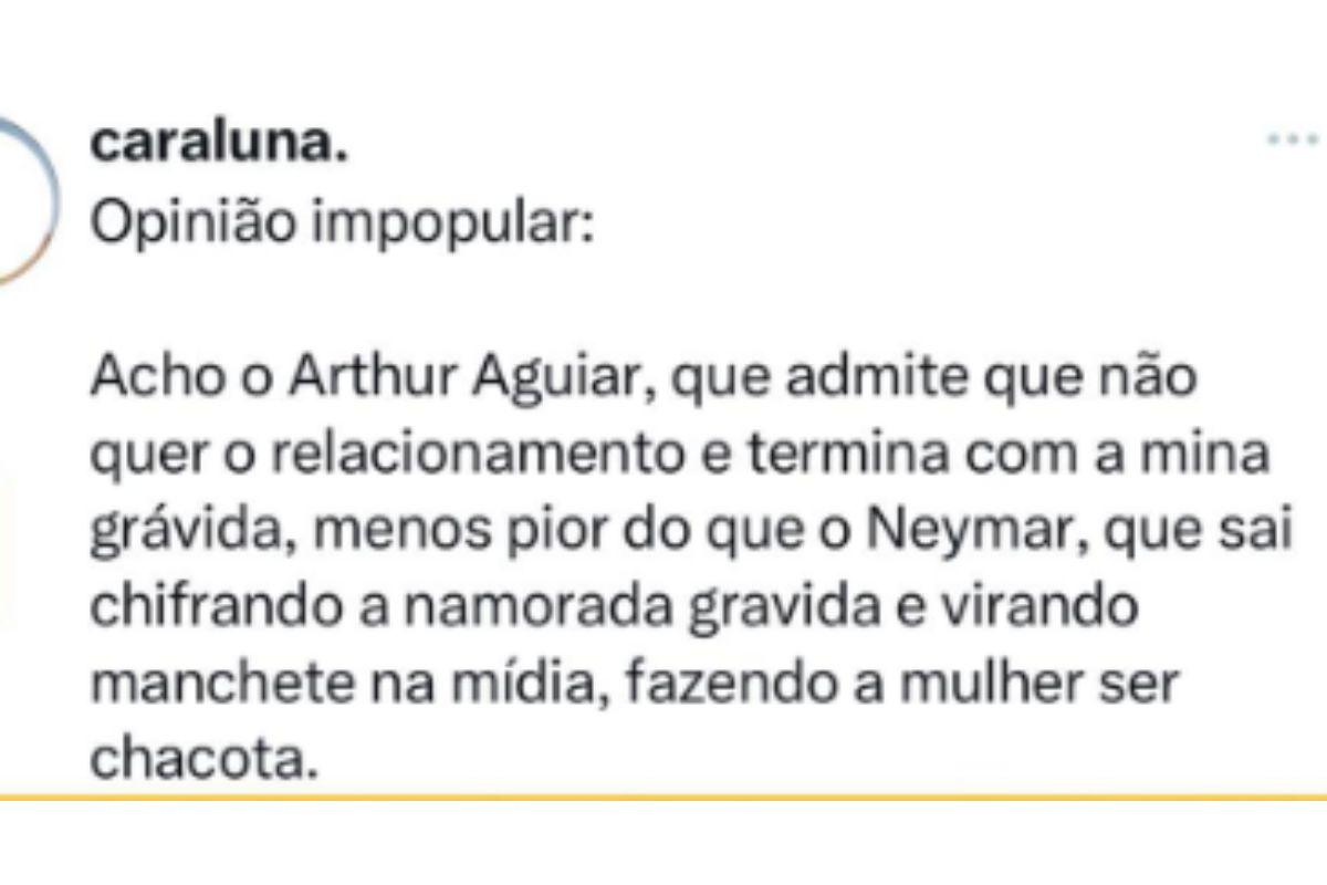 “Opinião impopular: Acho o Arthur Aguiar, que admite que não quer o relacionamento e termina com a mina grávida, menos pior do que o Neymar, que sai chifrando a namorada grávida e virando manchete na mídia, fazendo a mulher ser chacota”, escreveu uma internauta.