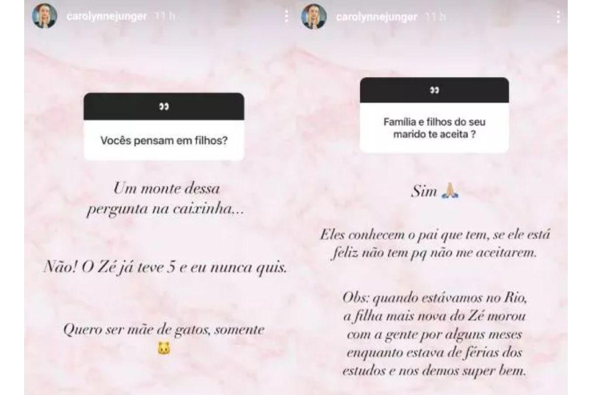 Nos stories do Instagram, um dos internautas questionou: “Vocês pensam em ter filhos?”. Carolynne foi bem sincera e explicou: “O Zé já teve cinco [filhos] e eu nunca quis”. Ainda complementou com uma brincadeira: “Quero ser mãe de gatos somente”.
