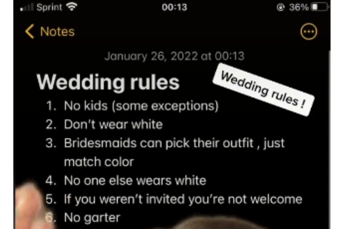 Entre outras regras estão “as damas de honra podem escolher sua própria roupa, mas quem escolhe a cor, sou eu”, “Se você não foi convidado, não é bem-vindo”, “Nenhum grande anúncio na festa” e “Nenhum motorista bêbado”.