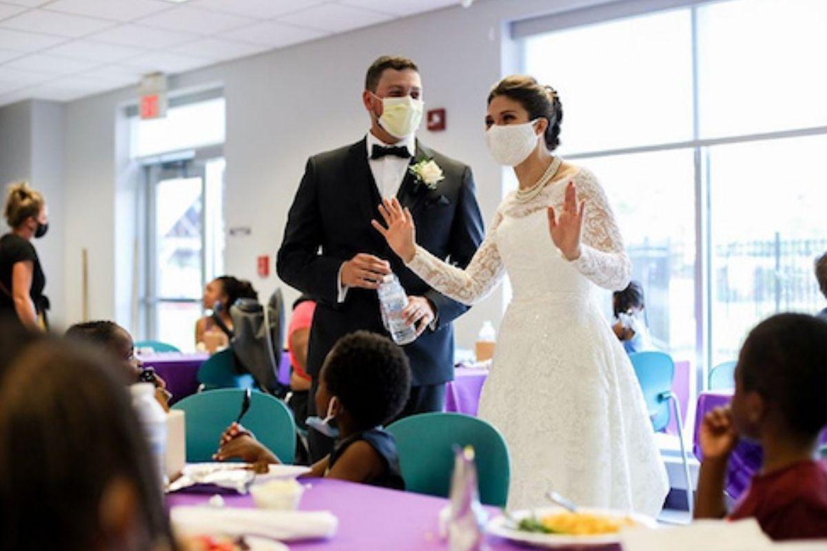 Por causa da pandemia, a grande festa que os americanos tinham planejado teve que ser alterada para um simples casamento civil, com apenas 12 convidados. Como toda a cerimônia já tinha sido paga, a única dúvida era o que fazer com tudo aquilo. E assim os dois decidiram levar a refeição até o Laura’s Home Women’s Crisis Center, um abrigo para mulher solteiras com filhos. Os noivos fizeram questão de estar presentes no momento e conversar com as pessoas que estavam lá – ainda com os trajes da festa!