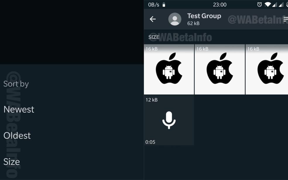 Já dentro das opções de uso de armazenamento de uma conversa específica também rolará uma mudança. O WhatsApp está testando criar um filtro para o usuário gerenciar as fotos trocadas naquela conversa. Dá para ordenar as imagens por tamanho, mais novas e mais velhas. Ainda na área de uso de armazenamento, o WhatsApp está testando  a possibilidade do usuário limpar todas as mensagens, exceto as favoritadas na conversa.