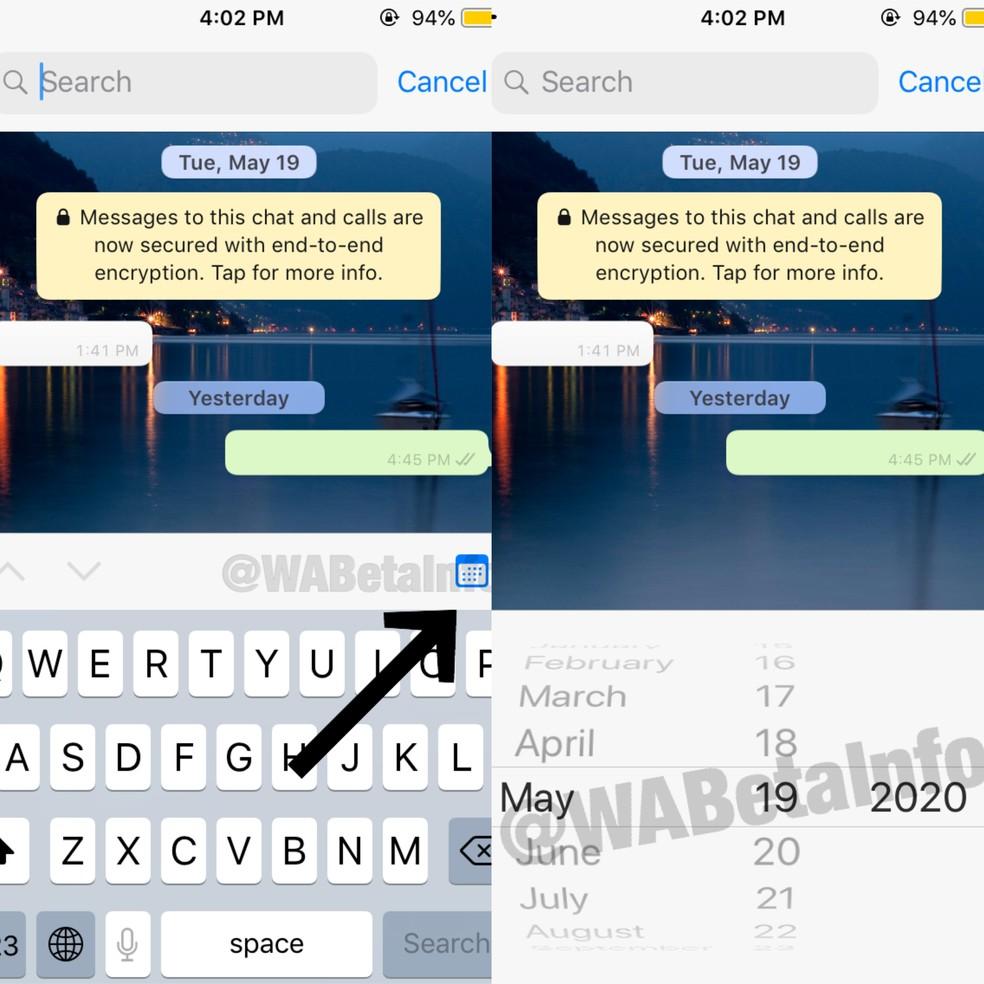 Quem nunca quis achar uma mensagem específica daquela data certa, mas não faz ideia de como ela era. Esse novo recurso vai permitir em breve a busca de mensagens por datas dentro da conversa. O recurso será adicionado à função atual de pesquisar mensagens em uma conversa. No campo do teclado, será incluído um ícone de um calendário no topo superior direito. Ao clicar nesse calendário, o usuário poderá selecionar uma data exata para ver as mensagens enviadas naquele dia.