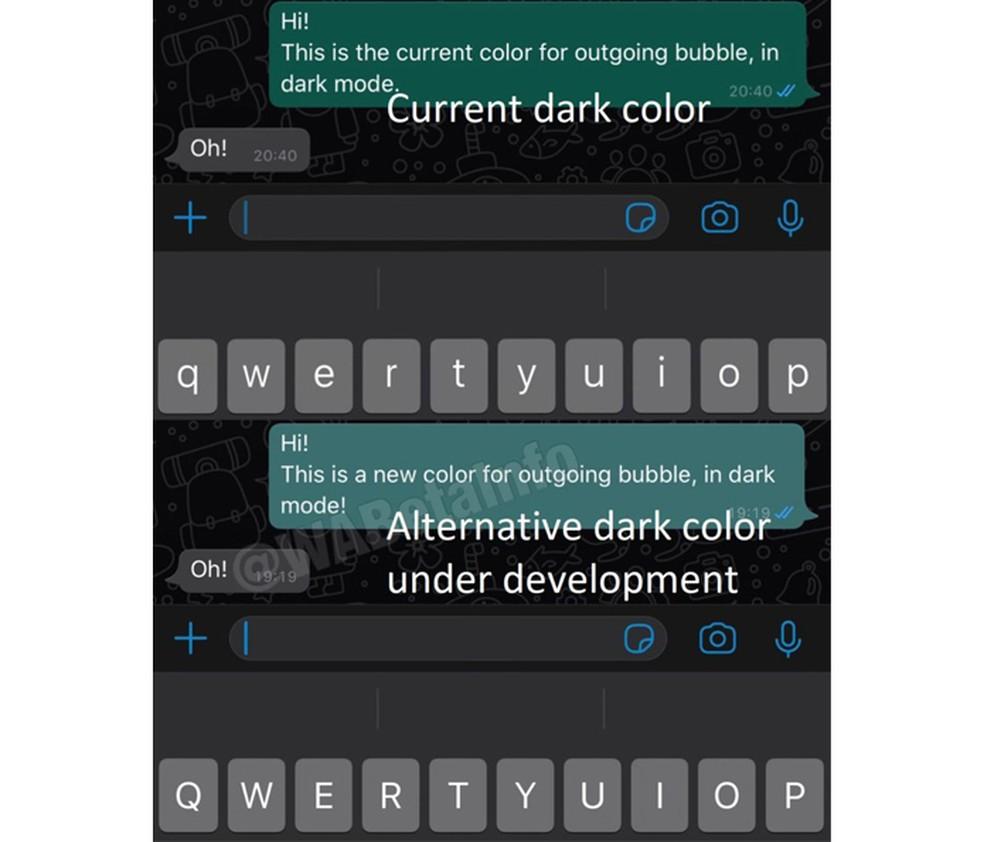 Outra novidade notada é uma pequena mudança no modo escuro na janela de conversas. A cor verde do balão de mensagens aparece um pouco mais claro do que o original na versão beta do iOS. Ainda não se sabe o porquê da modificação, ou se o WhatsApp planeja modificar outras cores ou adicionar novas.