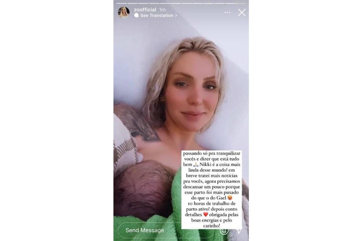 Ela publicou uma selfie descontraída onde apareceu com o recém-nascido no colo e contou detalhes sobre o parto: “Passando só pra tranquilizar vocês e dizer que está tudo bem. Nikki é a coisa mais linda desse mundo! Em breve, trarei mais notícias pra vocês, agora precisamos descansar um pouco porque esse parto foi mais puxado que o do Gael. 10 horas de trabalho de parto ativo! Depois conto detalhes. Obrigada pelas boas energias e pelo carinho!”.