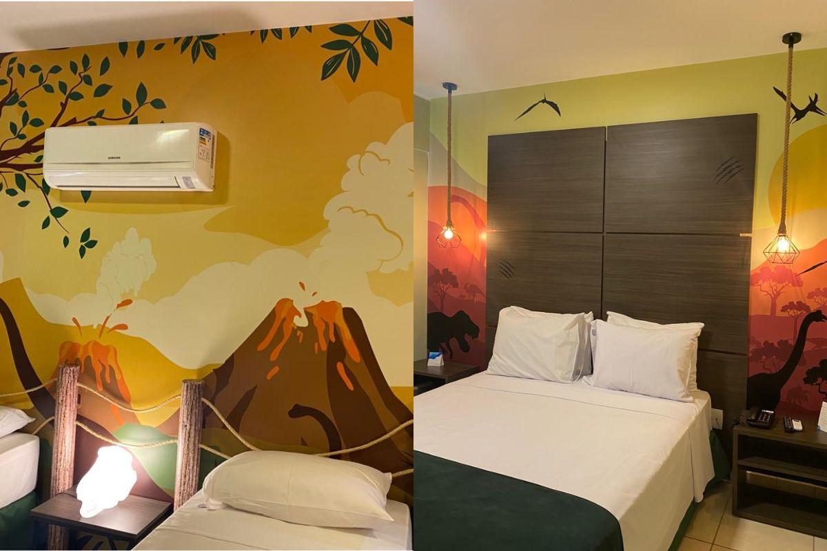 As acomodações são para a família inteira, com varanda, TV e até mesmo, área de trabalho com wi-fi. Um dos quartos que conhecemos foi um temático de dinossauros, com pegadas na porta, desenhos do mundo dos dinossauros atrás da cama e vários adesivos divertidos, como “Cuidado, Dinoussauro”, “Área restrita” e “Área de segurança”.