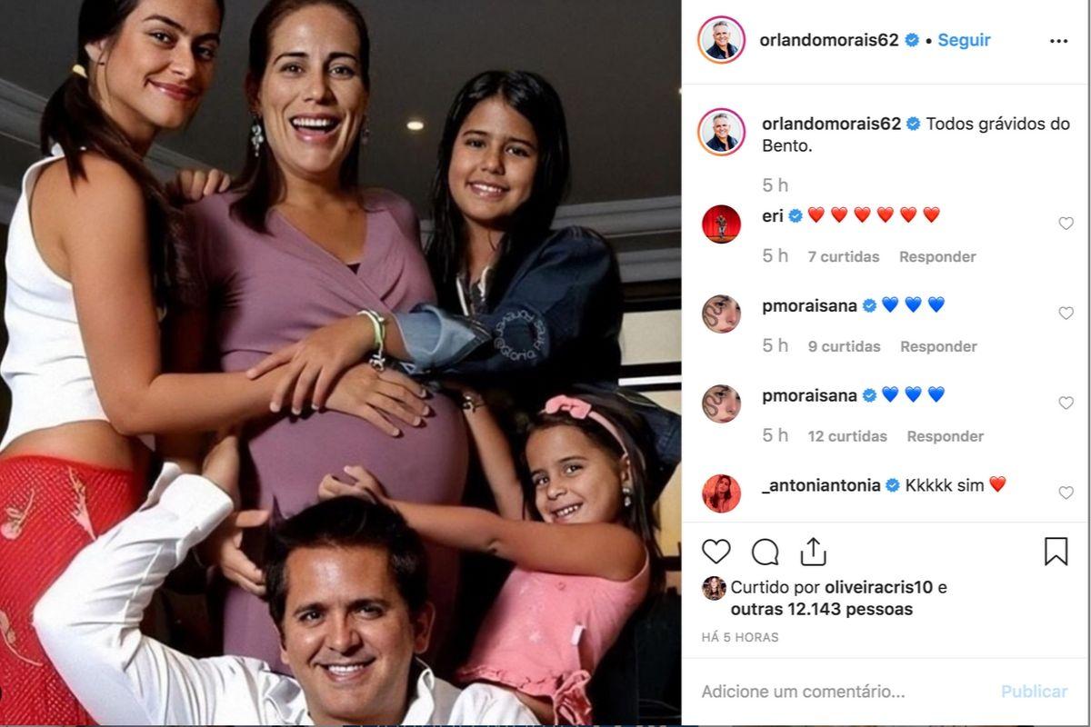 A atriz aparece em foto cercada pelas três filhas: Cleo, Antônia e Ana Morais. Todas aparecem sorrindo e felizes com a gravidez do caçula. “Todos grávidos do Bento”, escreveu Orlando em legenda.