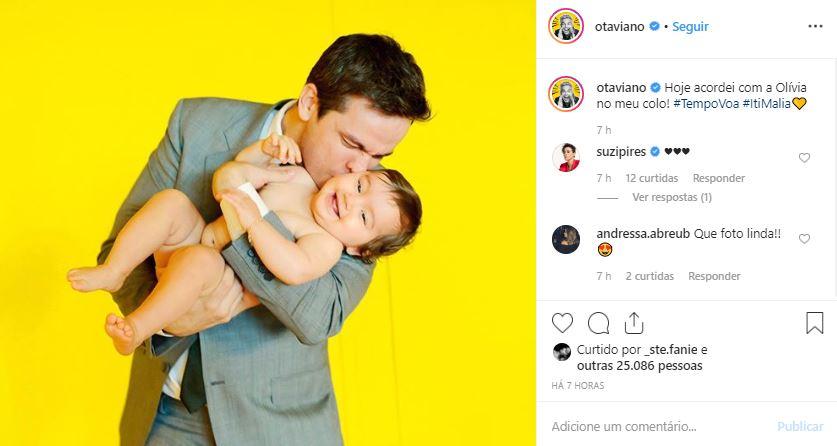 “Hoje acordei com a Olívia no meu colo! #TempoVoa #ItiMalia”, disse Otaviano na legenda da publicação. Olívia é fruto do relacionamento de Otaviano com a atriz Flávia Alessandra.