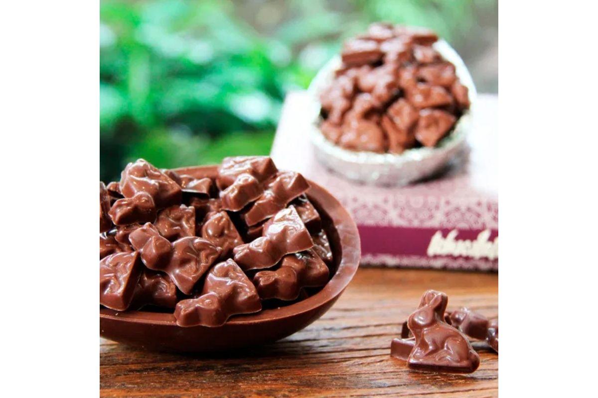 Descrição: Ovo de Páscoa com casca de chocolate Au Lait e Paçoca. Dentro, ovinhos Paçoca e coelho Au Lait.