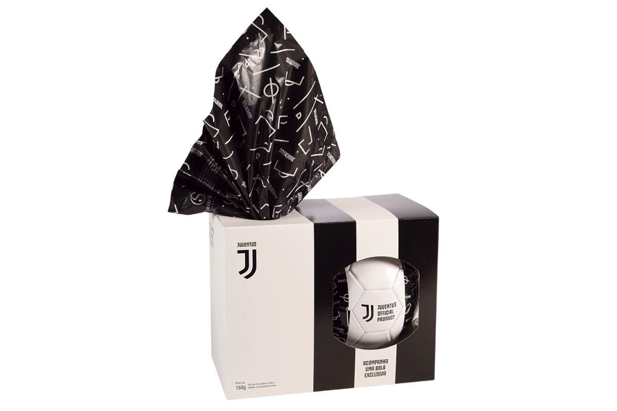 Descrição: ovo de chocolate ao leite que acompanha bola exclusiva do time internacional Juventus