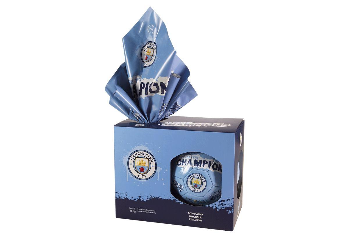 Descrição: ovo de chocolate ao leite. Acompanha bola exclusiva do time internacional Manchester City